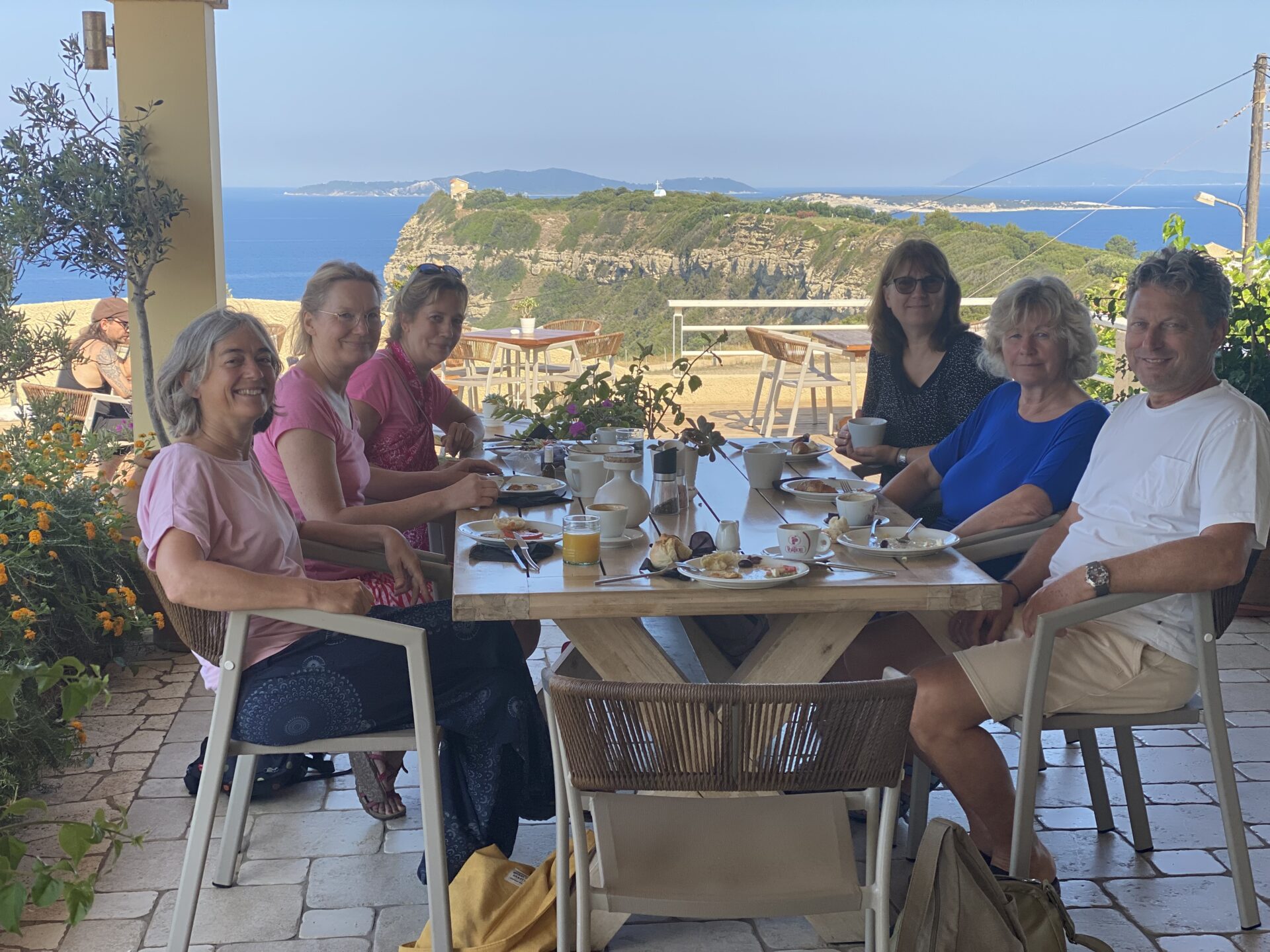 Das Frühstück wird im nahegelegenen Cafe „Akrotiri“ – auf dem Grad mit Blick nach Arillas und St. Stefanos – serviert, wo auch die Gruppenaktivitäten stattfinden.